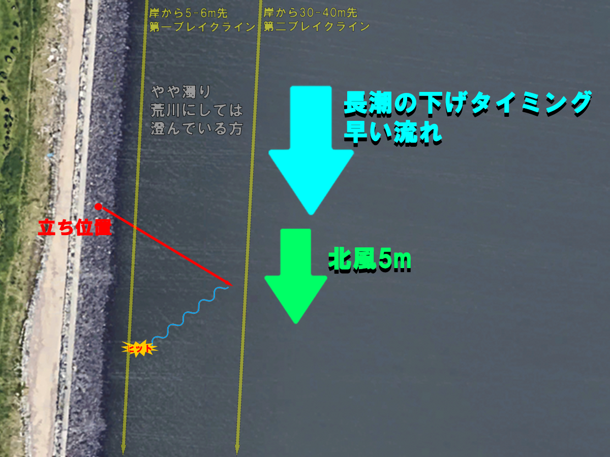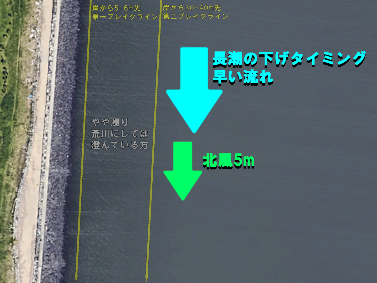 この河口エリアは河岸に沿って沖に5-6mのところに第一ブレイクラインがあり、そこで約2m落ちており、次に沖30-40mのところに第二ブレイクラインがあり、ここでおそらく1-2m落ちていると感じだと思います。