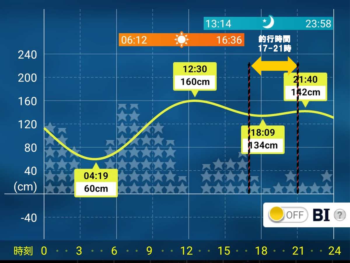 ①このエリアでのこの時期の釣りは潮位130㎝、レンジは水面下60㎝以内、ベストは30-60㎝であること
