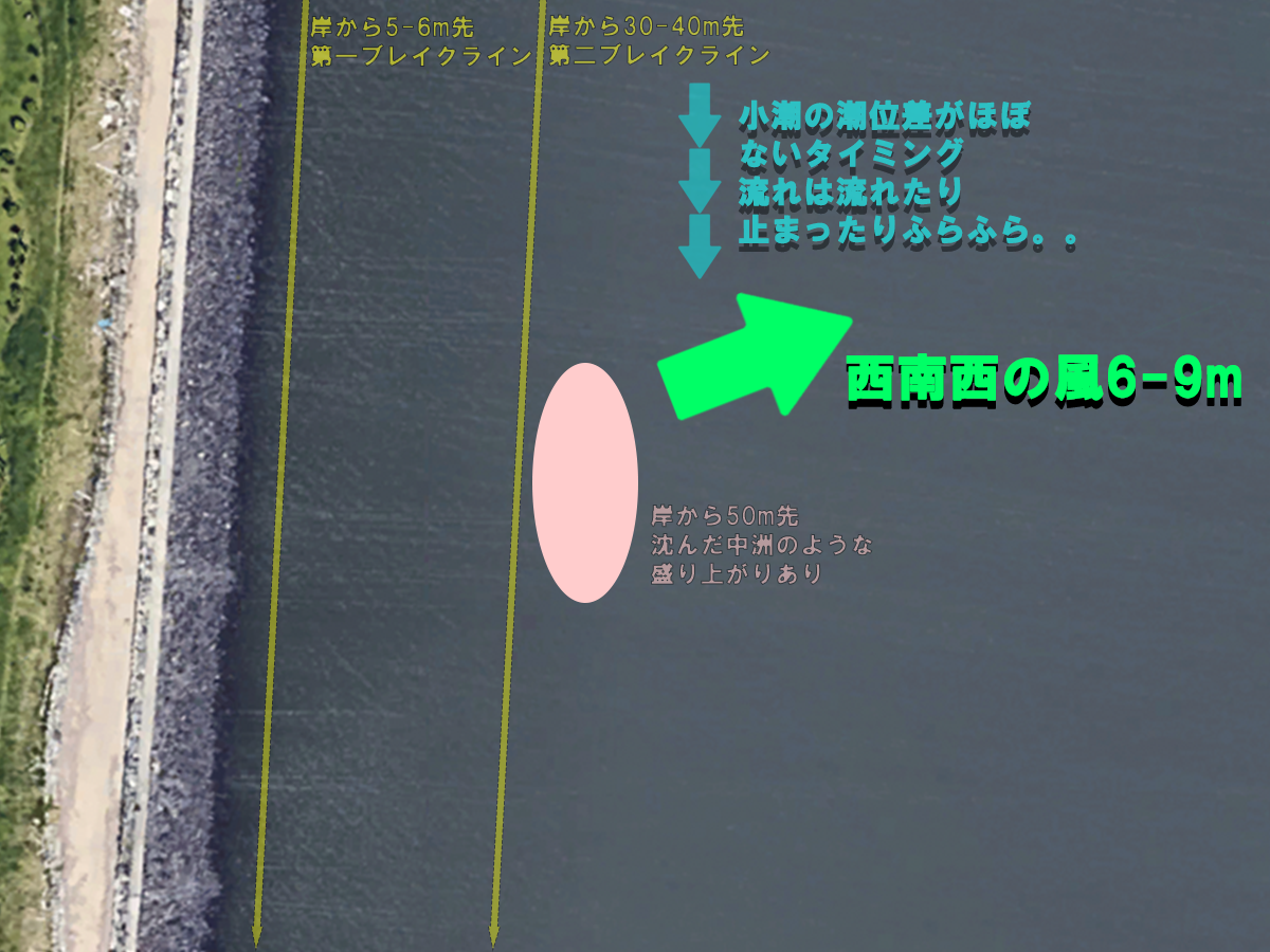 この河口エリアは河岸に沿って沖に5-6mのところに第一ブレイクラインがあり、そこで約2m落ちており、次に沖30-40mのところに第二ブレイクラインがあり、ここでおそらく1-2m落ちていると感じだと思います。