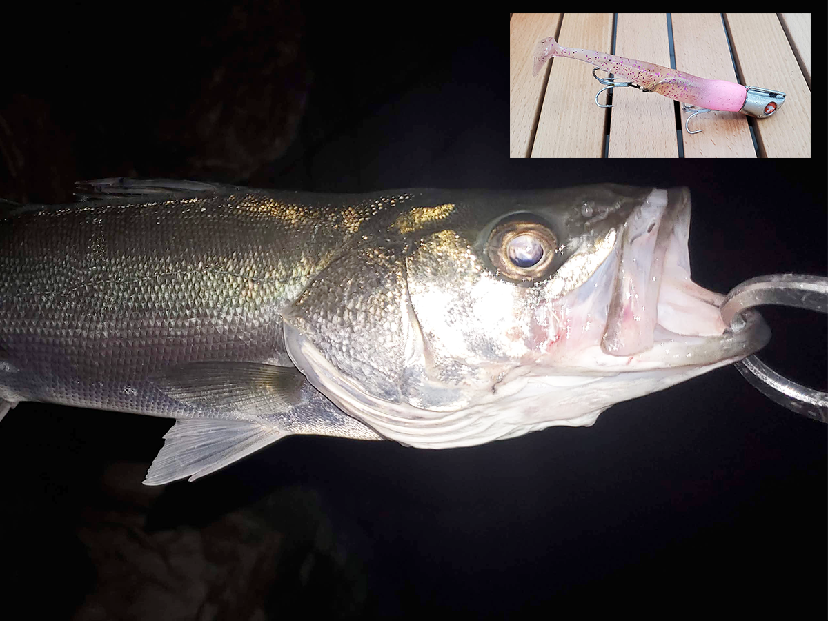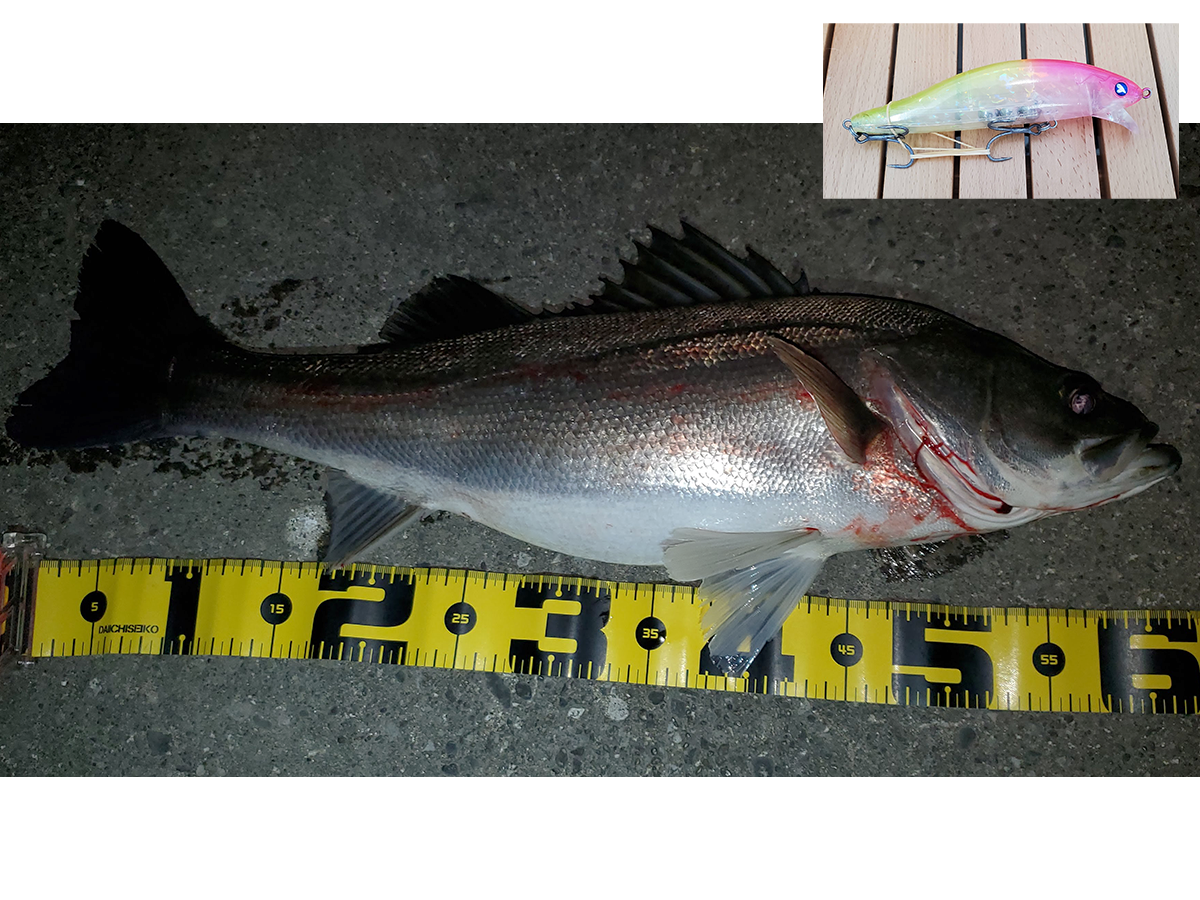 ゼッパー140ハイフロートマットチャートから始めましたが反応がなかったため同じくゼッパー140Fのピンクチャートクリアに変更の一投目にバイト。65㎝のシーバスをキャッチ。