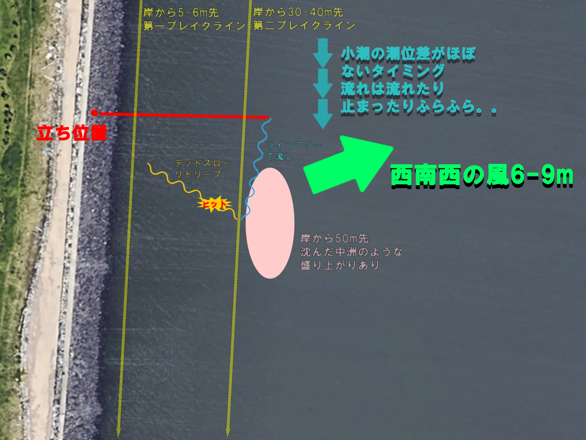 あたりがでたのは岸から20-30メートルのところにあるブレイク周辺。