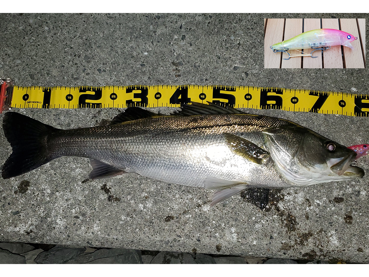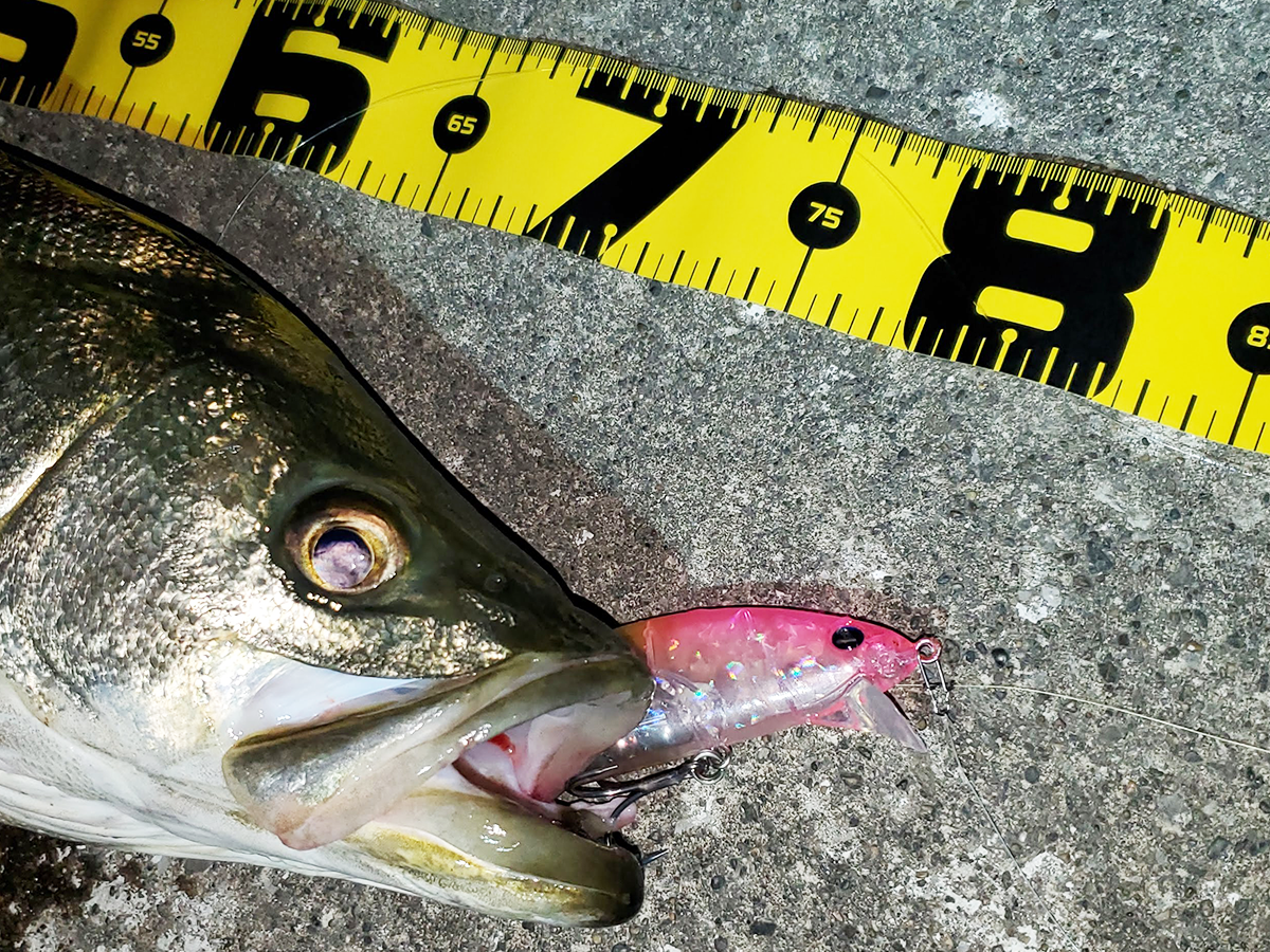 偶然通りがかった釣り人からベイトはコノシロとお聞きしてから実はしつこくゼッパーを投げておりましたがまさにそれが当たり、この魚のヒットルアーはゼッパー140F ピンクチャートクリアカラー。