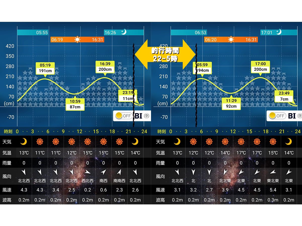 大潮の4:18、満潮間際で潮位は190cmくらい。満潮間際ということもあり流れは少し緩んでいたと思います。風は北の風3mでほぼ真左から風を受ける感じ。