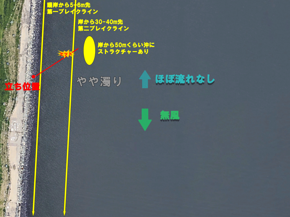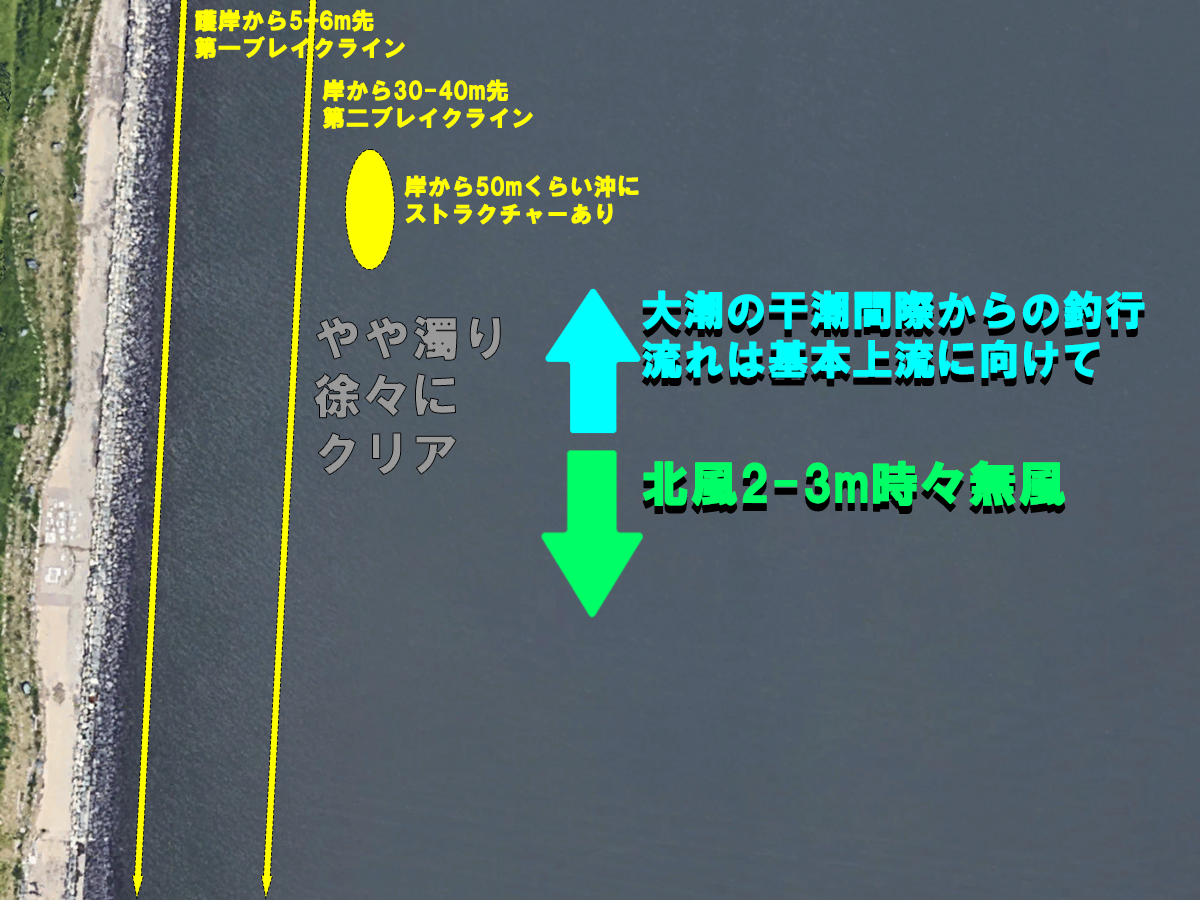 この河口エリアは河岸に沿って沖に5-6mのところに第一ブレイクラインがあり、そこで約2m落ちており、次に沖30-40mのところに第二ブレイクラインがあり、ここでおそらく1-2m落ちていると感じだと思います。