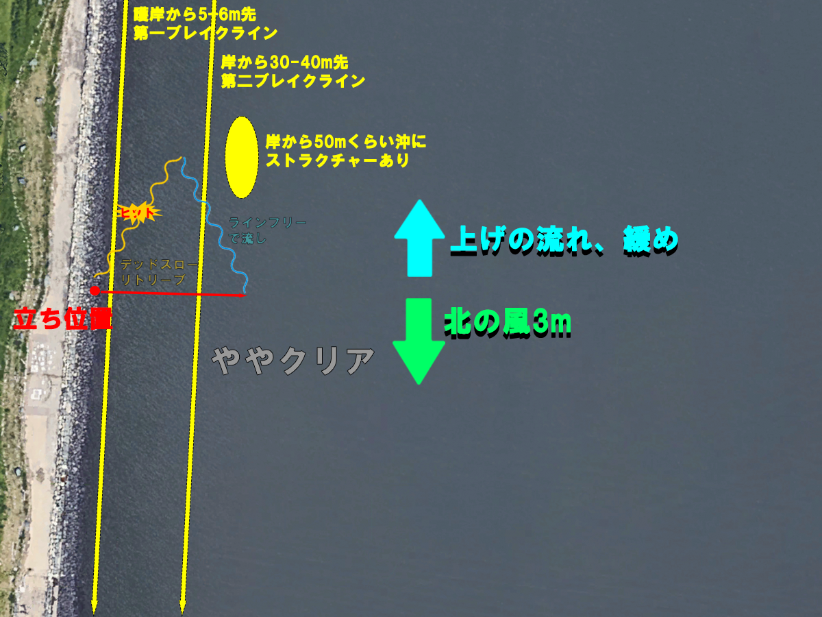つまり、風を上流側から受けながら、クリア気味の水質の中、下流から上流へ強めの流れが発生している、そんな状況でした。