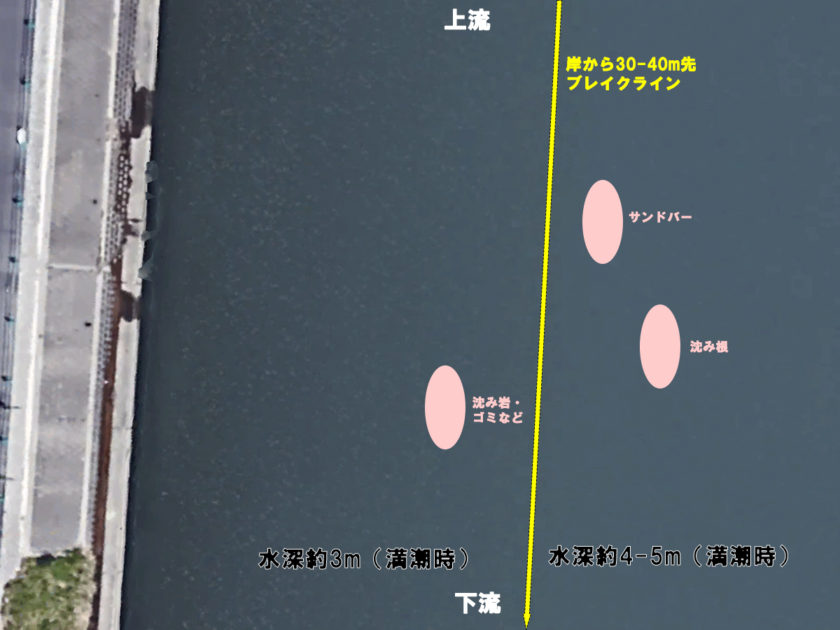 また、川底の所々にサンドバー、沈み石、ゴミなどが沈んでいるため底をズル引きすると根がかりするところも点在しており、その上その場所が日によって異なるためボトム中心の釣りをされる方はかなり注意が必要だと思います。