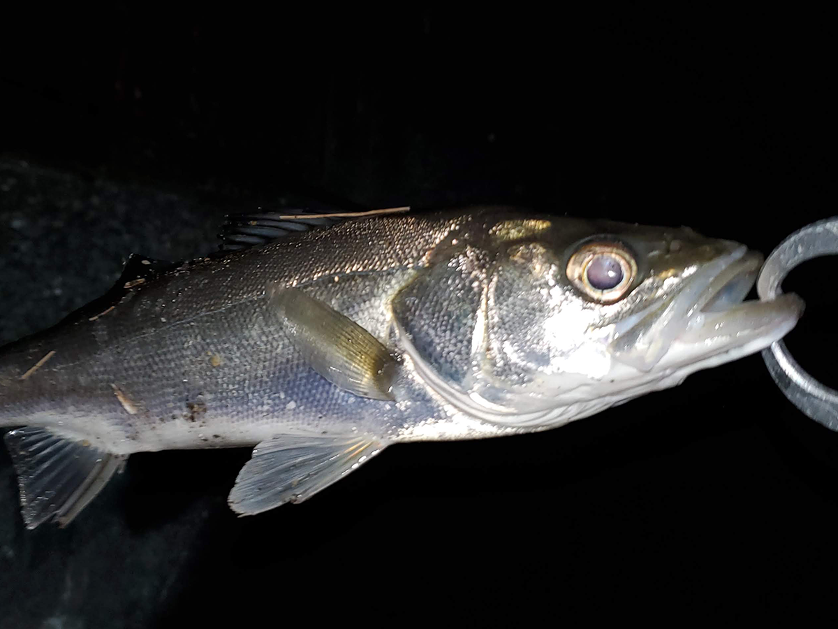 下流から上流に少しずつ移動する潮目に沿って何度かキャストするとショートバイトが出る場所を発見、そこを重点的に狙い何度かキャストしたところかわいいシーバスが遊んでくれました。笑