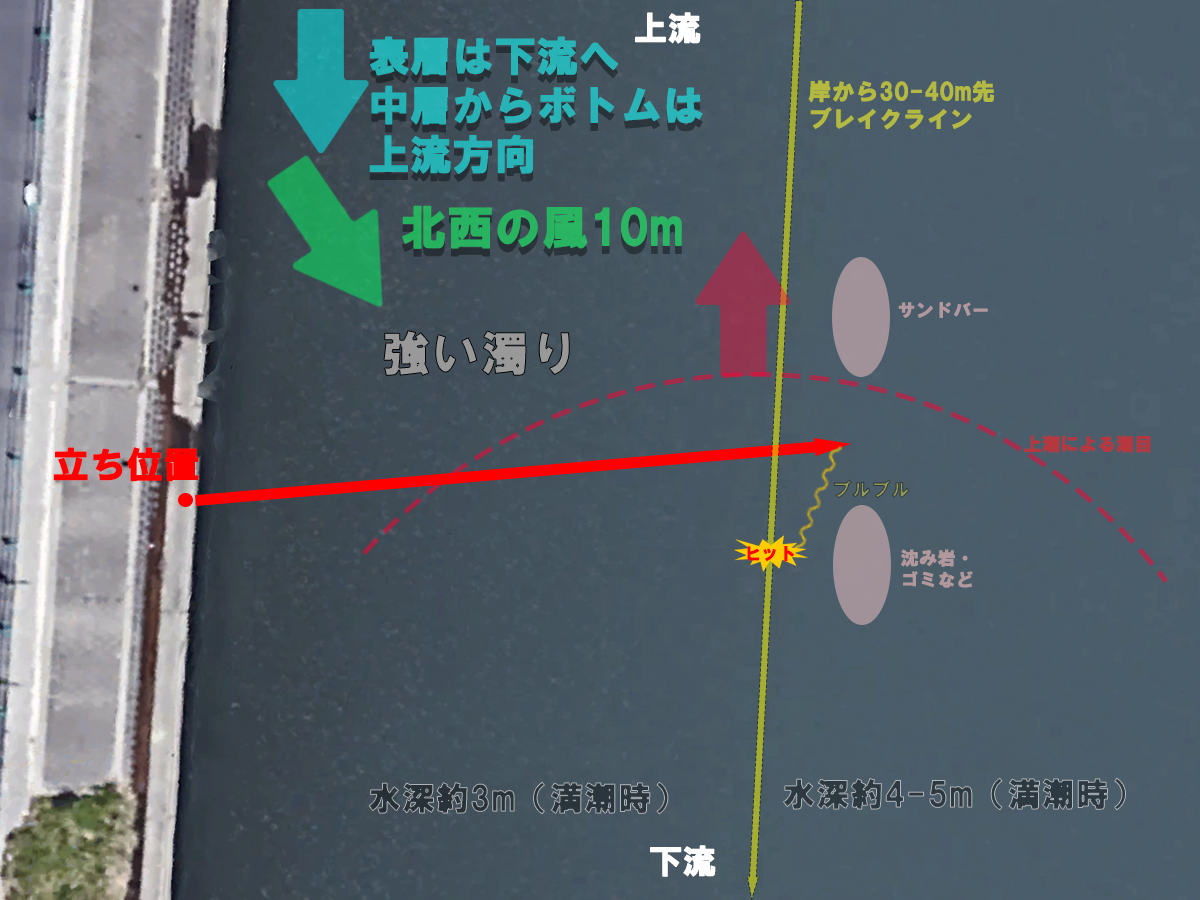 上潮が効き出しタイミングで川と垂直方向に潮目が下流から上流に上がってきていることを確認できたためそこを追いかけるように狙ってVJを入れていました。