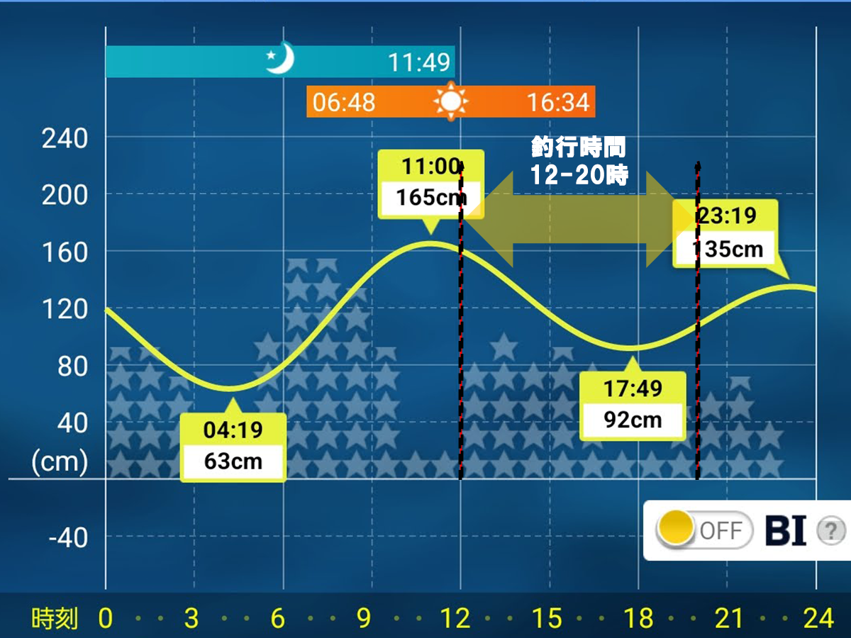 潮は小潮の3日目、満潮直後、潮位約160cmからスタートし、干潮92cmを超え、上潮の潮位100cmくらいまでの釣行。濁りはほぼなくクリア、流れは下潮時は右から左、上潮時は左から右と変化。ただ、潮位差が70cm程度しかないためそれほど強い流れではありませんでした。