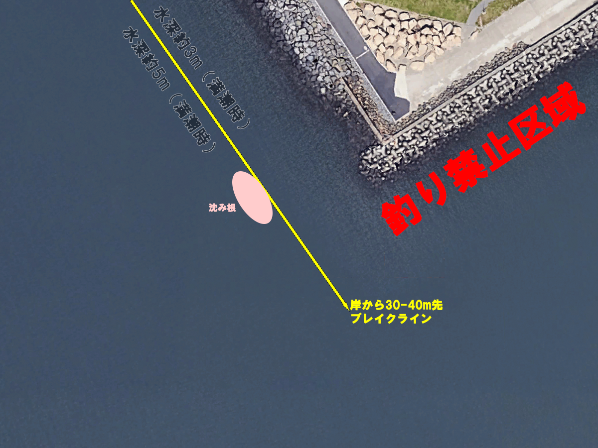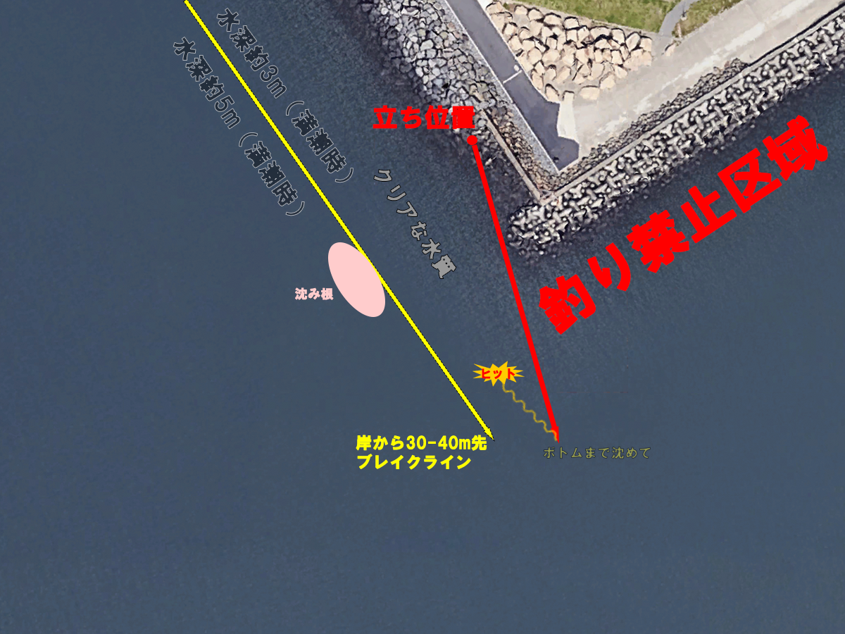 岩場が途切れる沖30-40mのラインの水深は満潮時でおそらく3-4m、そして、そのブレイクラインによりさらに1-2m深くなり、そこからはおそらく砂地だと思います。