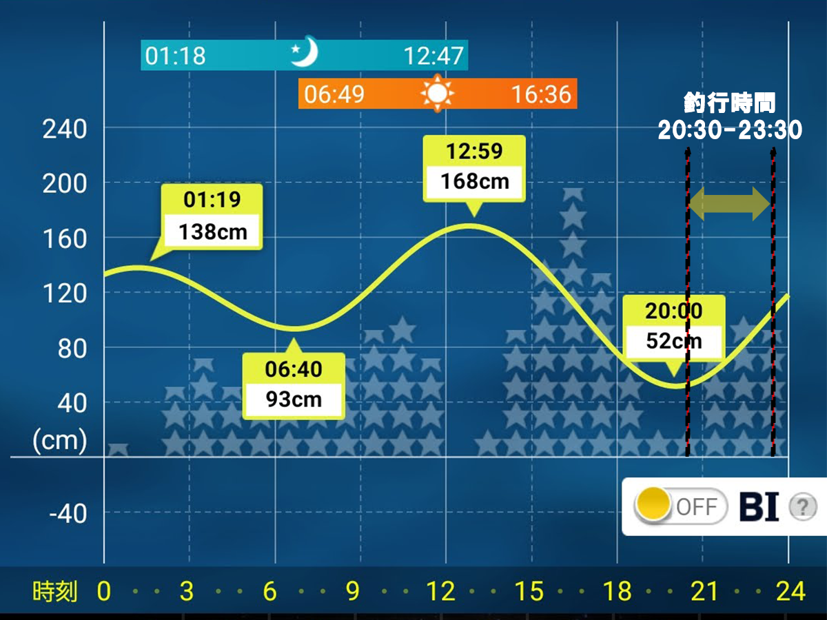 若潮の夜20:30、潮位は約90cmで上げ4分くらい、流れはそれほど強くないが左から右へ流れている状況。