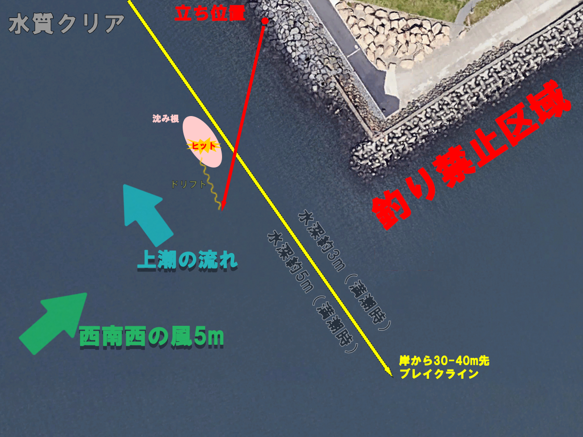 上潮時は傾向的に沖から岸方向に、下潮時は岸から沖方向に流れが発生する傾向が強く、潮のタイミングや風の状況次第でかなり流れが複雑に変化する場所でもあると思います。