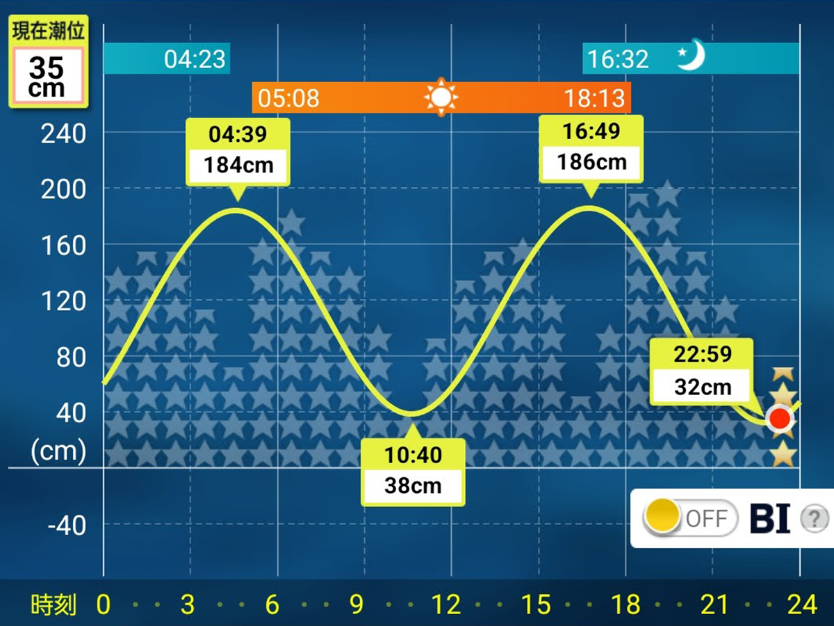 大潮2日目の23:30、潮位は180cmで下げが始まったタイミング、次の潮止まり干潮39cmまで潮位差155cmを一気に下る流れは強く右から左へ流れている状況。