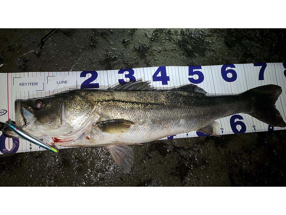 すると着水から2−3巻でガツンという強い当たりと同時に沖で水飛沫が上がるのは見えました。その後何度か沖でエラ洗をされましたが素早くラインスラッグを取り、一定のテンションがかかるようにやりとり、その後いやにすーと寄ってきて、タモ入れまでそれほど苦労をしませんでしたが、シーバスが入っているタモを持ち上げようとした時にその重量感からデカイ!と感じ、魚体を見て、ワオ!という感じでした。笑