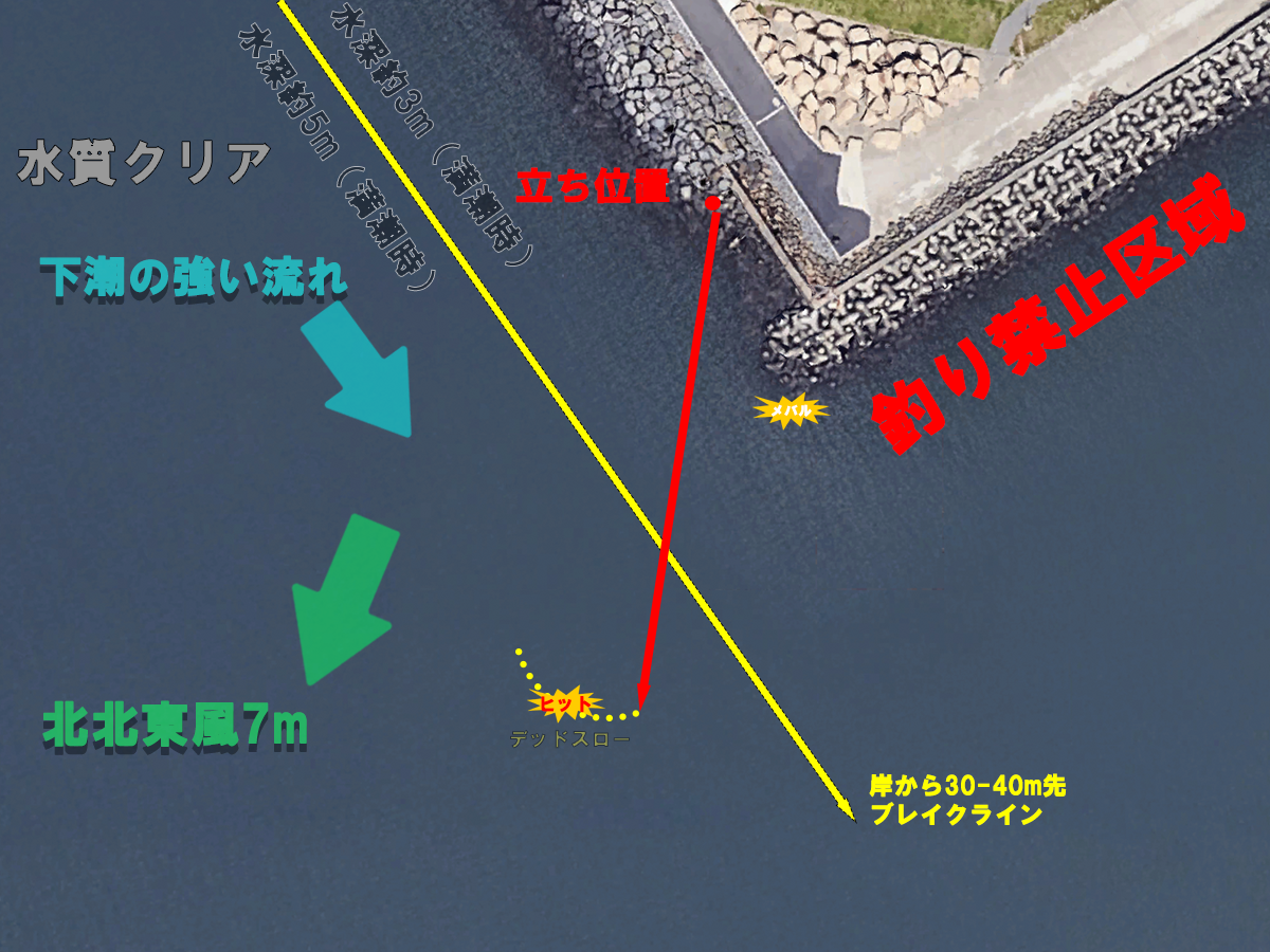 突端部から沖方向のダウンクロスにブローウィン125Fを入れ、流れに乗せるように若干沖に流しながらデッドスローにブローウィンを巻いてきました。