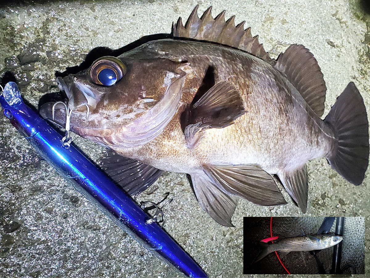 画像は今回のスペシャルゲストのメバル(とスレがかりしたボラ。笑)ですがそんな中でこのメバルがブローウィン165Fに食いついて来たことからバチ?と思い、そこからは持っているフローティングミノーの中で最も細身のブローウィン、特に水面直下を引きやすい125Fを投げ続けたことにより約1時間後に76cmのシーバスゲットにつながったのではないかと思います。メバル君、ありがとう!笑
