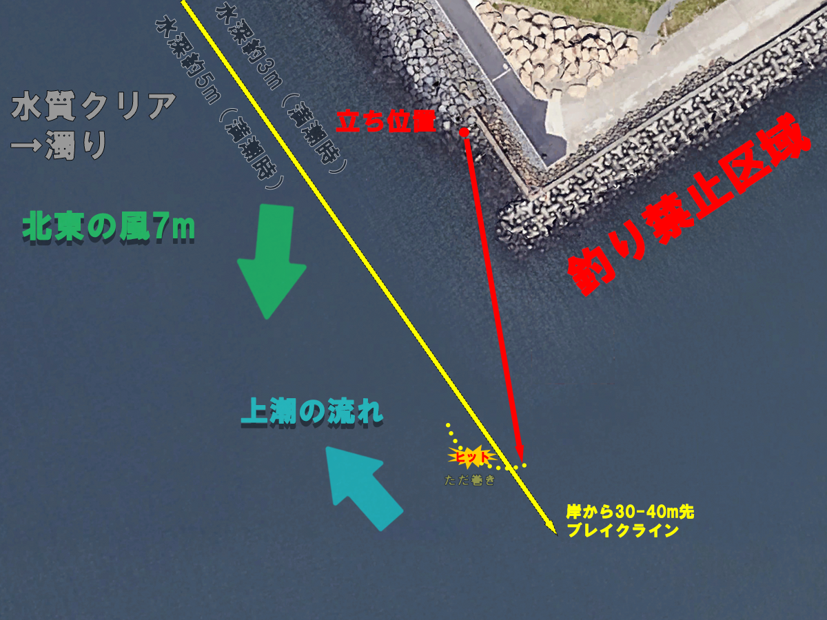 上潮時は傾向的に沖から岸方向に、下潮時は岸から沖方向に流れが発生する傾向が強く、潮のタイミングや風の状況次第でかなり流れが複雑に変化する場所でもあると思います。