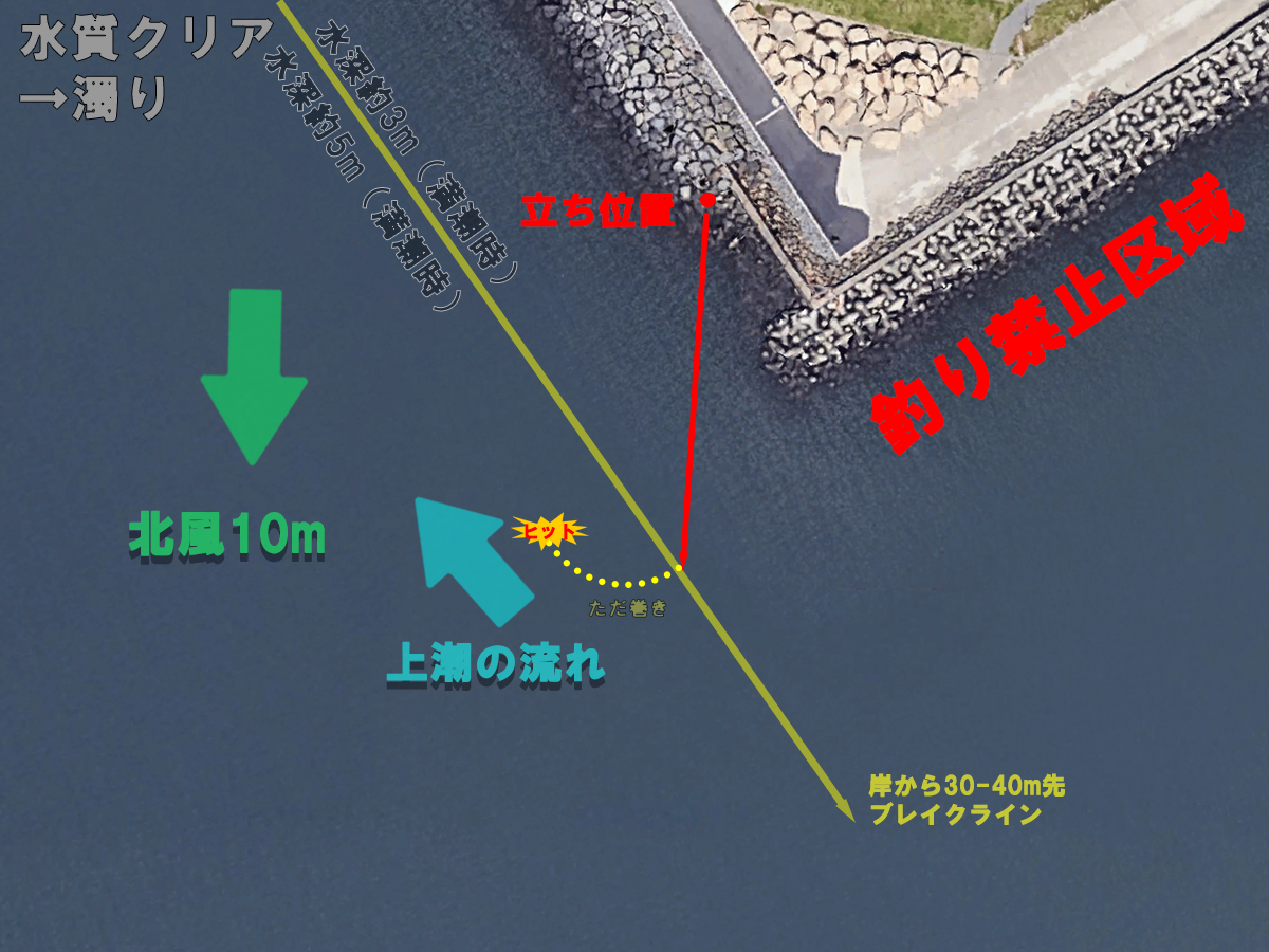 上潮時は傾向的に沖から岸方向に、下潮時は岸から沖方向に流れが発生する傾向が強く、潮のタイミングや風の状況次第でかなり流れが複雑に変化する場所でもあると思います。