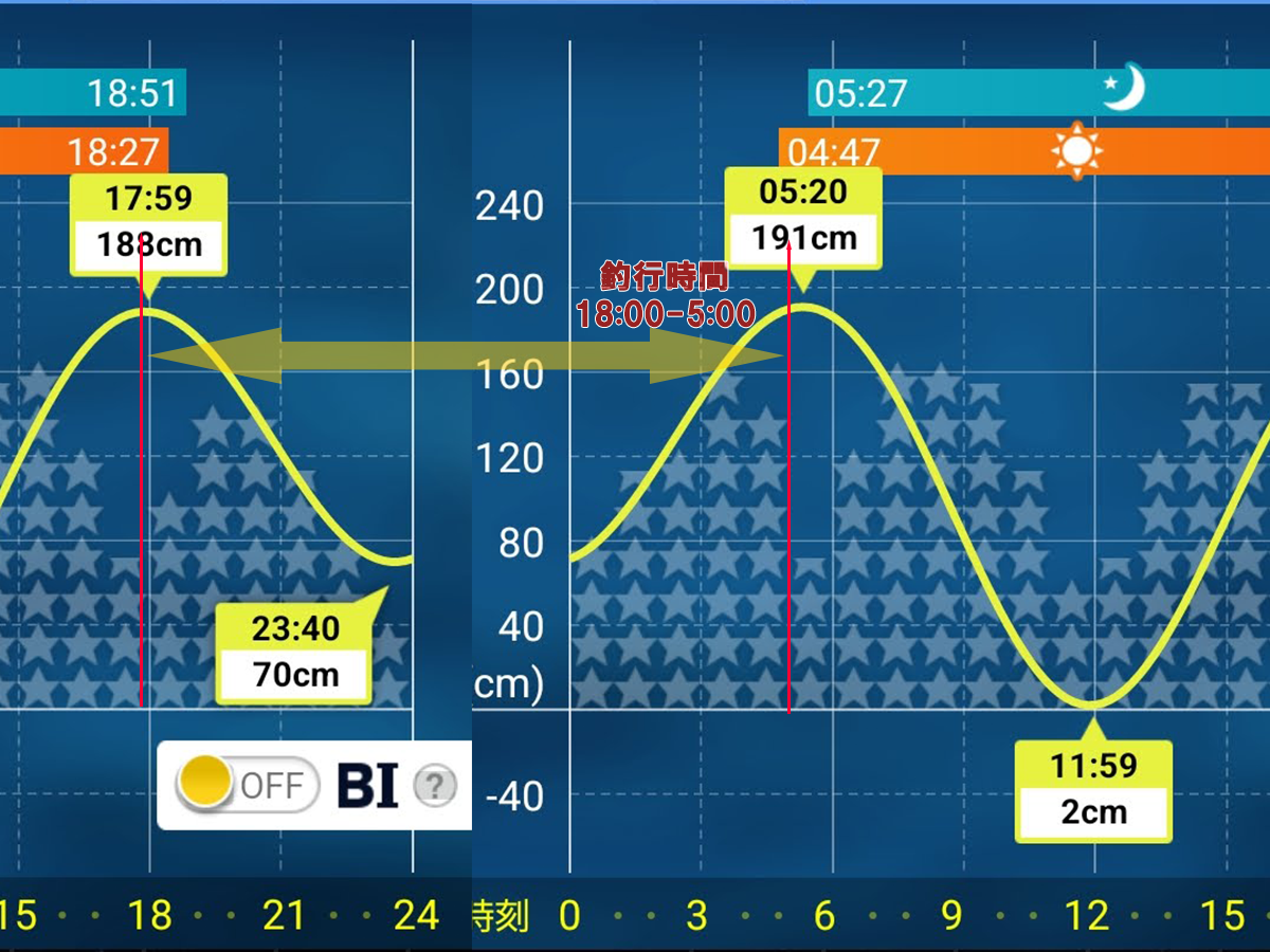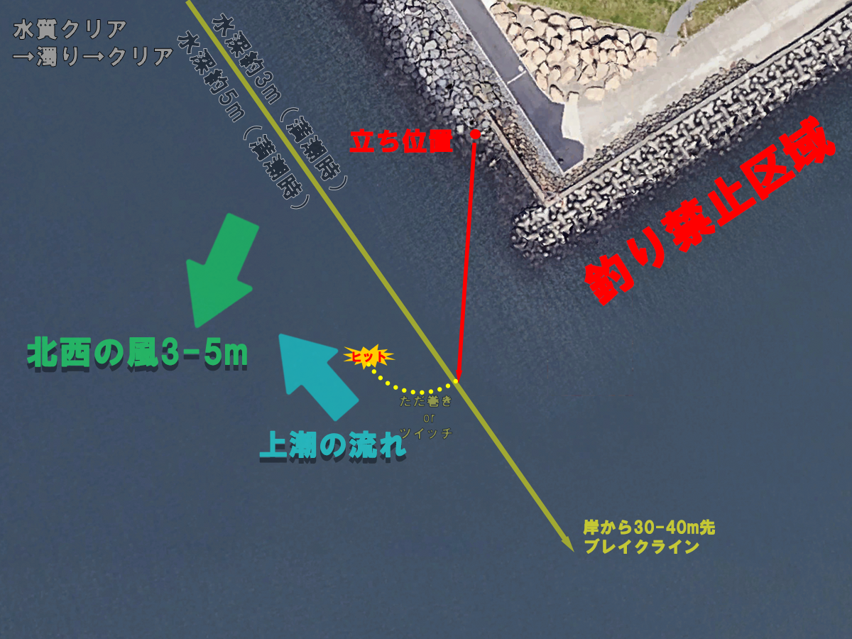 この日は北西の風だったため下潮時が流れと風が同調し最も流れが出ると予想。