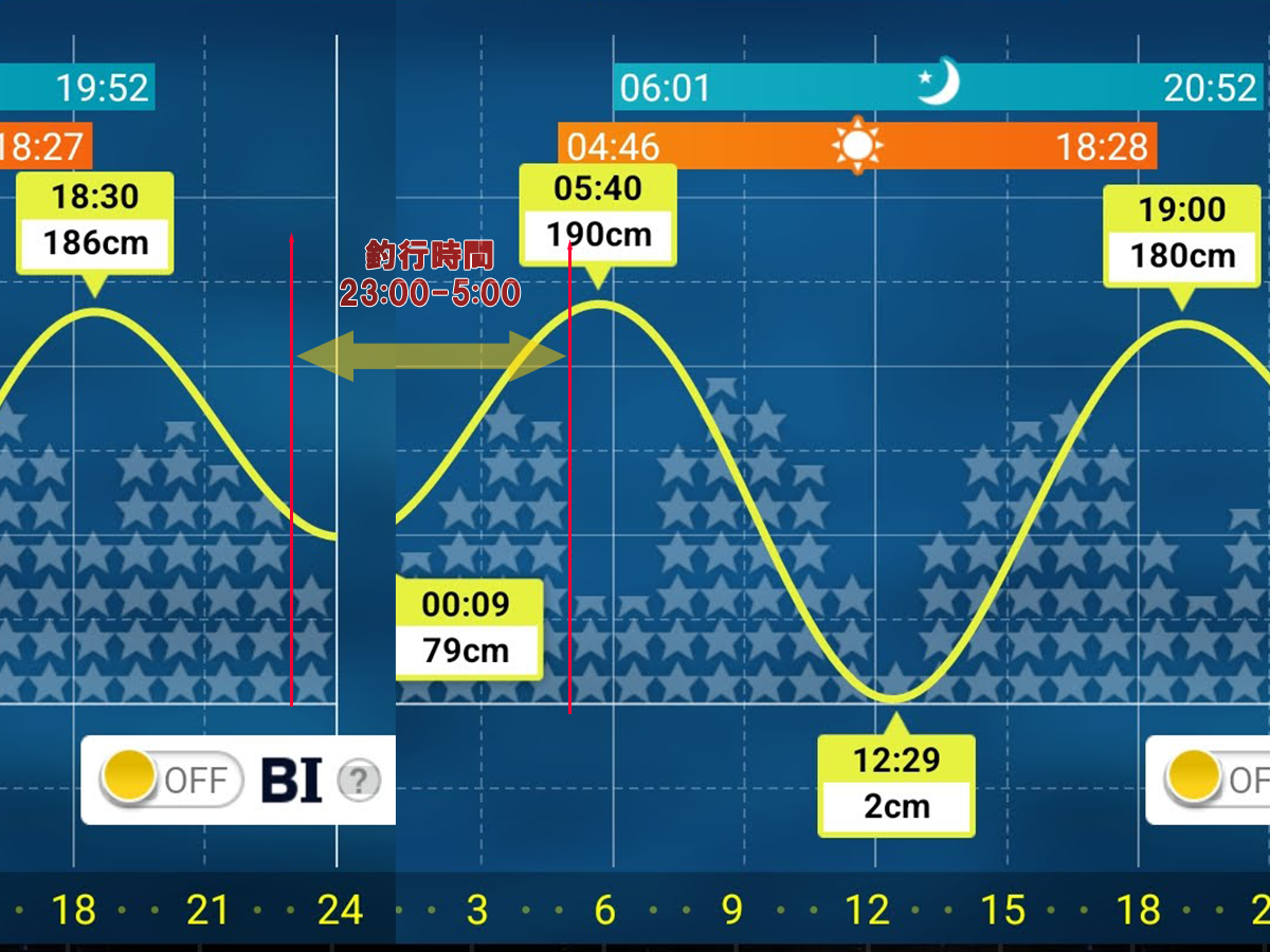 つまり、潮は前日とほぼ同じであるが風が逆向き、向かい風であるため軽めのバチルアーを投げるのは厳しいコンディション。