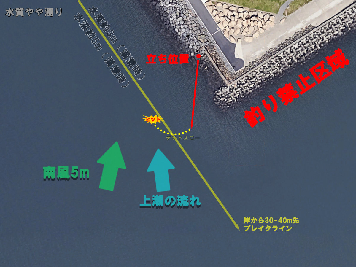 水質はいつも通り潮が上がると共にクリアからやや濁るが今回は南風に押され流れが当たっているせいかスタート時点で既に濁りが強め、流れは左奥から右手前へ当ててくる。