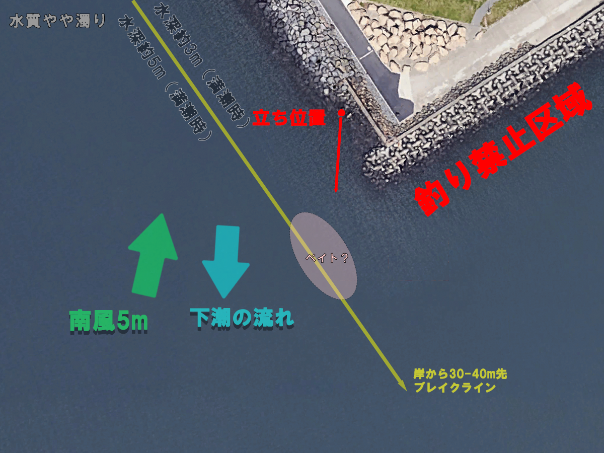 上潮時は傾向的に沖から岸方向に、下潮時は岸から沖方向に流れが発生する傾向が強く、潮のタイミングや風の状況次第でかなり流れが複雑に変化する場所でもあると思います。